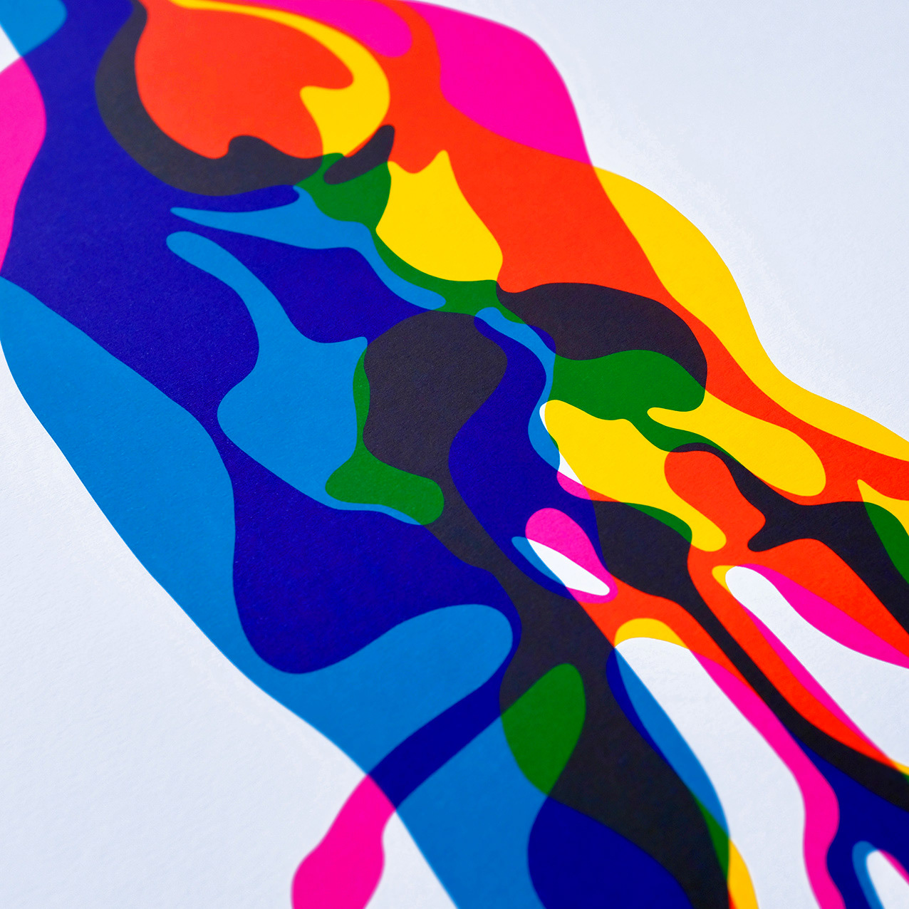 This artwork is created based on the physics of ink flowing with gravity. It uses 3 Pantone Colours of high-intensity fluorescent ink that glows under Blacklight (UV light) and also looks great in Daylight. With the overprinting technique, the 3 colours overlap to create many more brilliant shades.