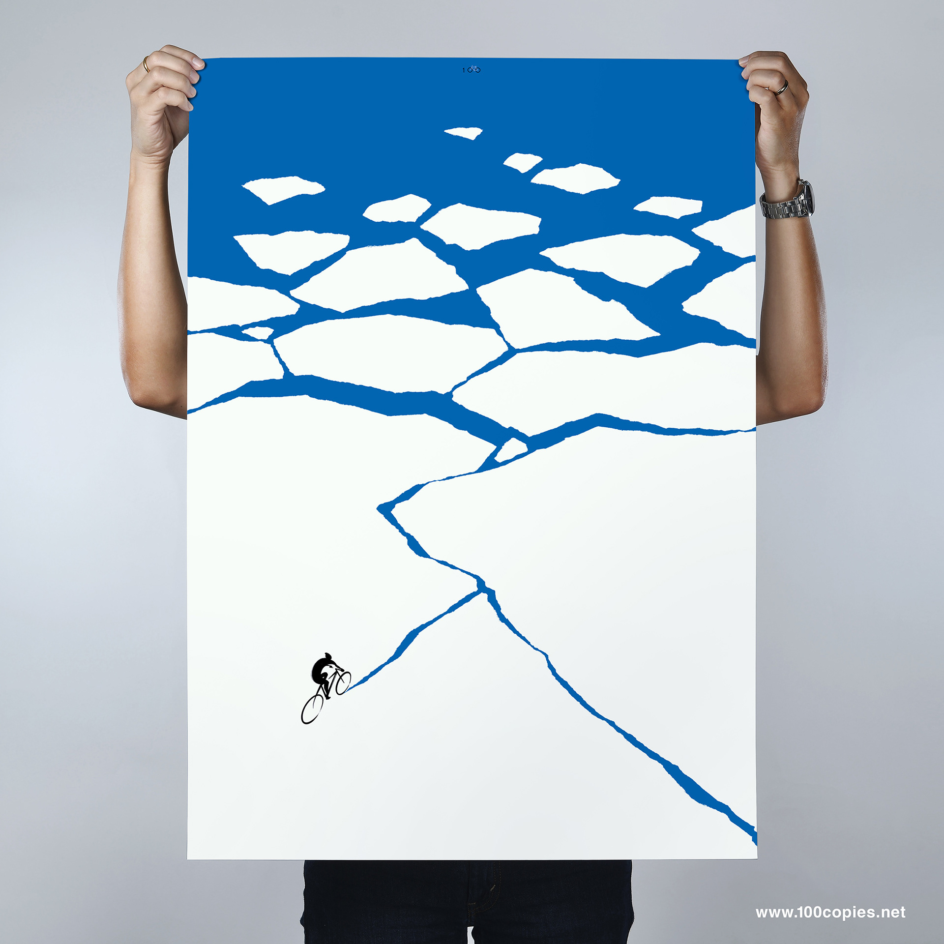 Cycling can change the world. By choosing to ride a bicycle, we contribute to the fight against global warming. This poster illustrates a cyclist riding against the crack line of an iceberg, sealing it with every pedal stroke. This symbolises how choosing bicycles can help slow the melting of polar ice caps, representing our ability to make a positive environmental impact through simple, everyday actions.